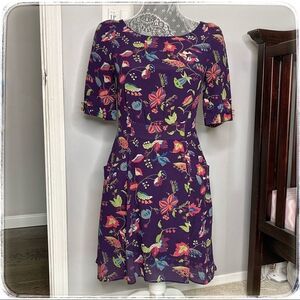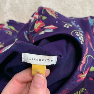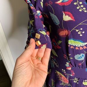 Vibrant dress by leifsdottir for Anthropologie. In excellent condition and perfect for spring and summer. Lightweight with exterior shell 100% silk, recommended dry clean. Features hidden side zipper and pretty matte golden buttons on sleeves. Lying flat armpit to armpit approx 16” across and top of shoulder to bottom hem approx 32”