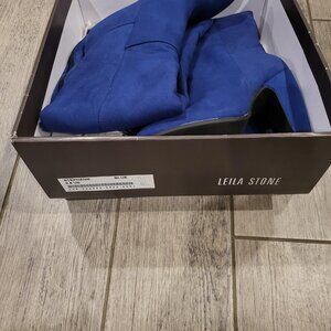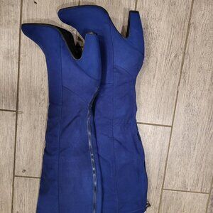 Make a bold statement with these vibrant royal blue suede boots by Leila Stone. Featuring a sleek pointed toe, tall shaft, and a sturdy block heel, these boots zip up in the back. Soft to the touch with a smooth finish, perfect for dressing up jeans, skirts, or dresses. Lightly worn and in excellent condition.