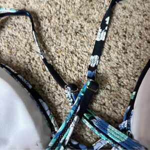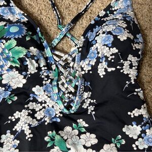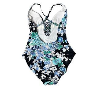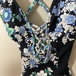 Leilani Aruba Cross Back Adjustable Strap Floral One Piece Style Y720285. Size 6. Black, white, blue and green. Light padded bra. Criss cross detail front plunge neckline. New with tags. Retail $98.00