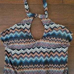 Leilani one-piece halter neck swimsuit in women's size 14. Multicolor zigzag pattern.