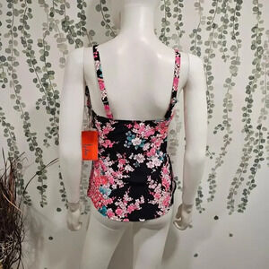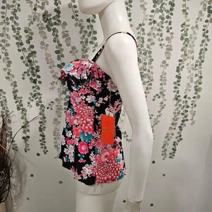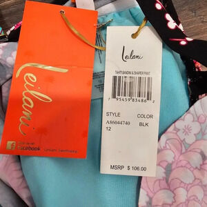 This is a brand new with tags Leilani swimsuit. It is a tankini top with a floral pattern. The swimsuit is black with pink and white flowers. It has a ruffled neckline and adjustable straps. The swimsuit is size 12.