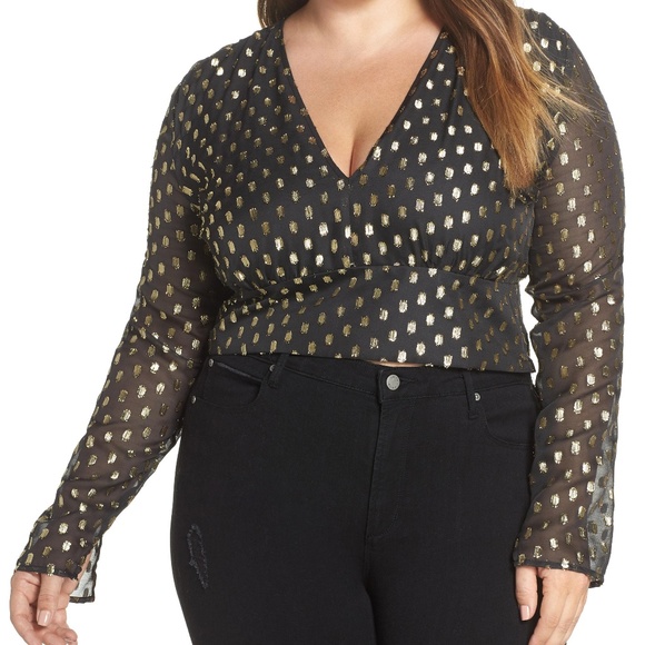 Gorgeous black top with gold metallic threaded dots from Leith, size 4X. Deep V neck with sheer sleeves and a cropped length. New with tags. 92% polyester, 8% metallic.