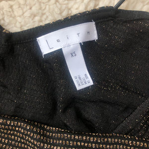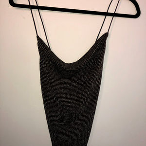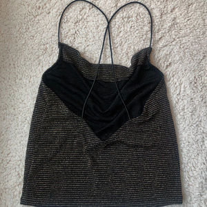 Black with gold embellishment. Open back with crossing spaghetti straps.Excellent condition, never worn
