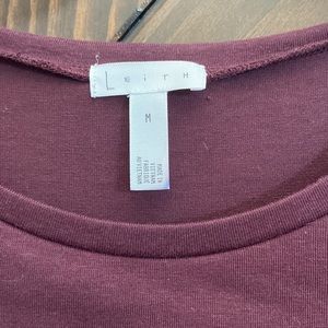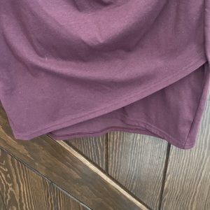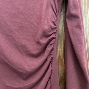 Plum bodycon dress with long sleeves l, rouche detailing on the side, and cross cross detail at the bottom.