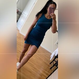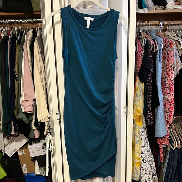 Elegant teal sleeveless dress with a stylish ruched design. Perfect for any occasion.