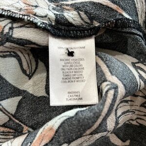 Leith faux wrap floral short sleeve shirt with a V-neck. It features a wrap front with a button closure and an extra button is included.