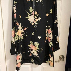 This is a beautiful Leith brand black floral print mock neck 100% polyester dress with cuff sleeves and partial open back with button closure. Its knee length and is a women's size large. Its in excellent condition!