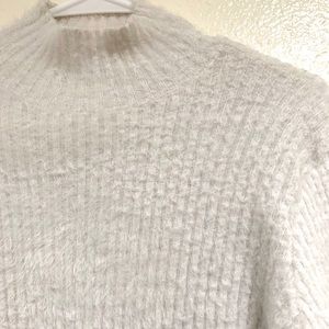 Made in China 100% Nylon Hand Wash Fuzzy white sweater with mock neck, long sleeves with large cuffs