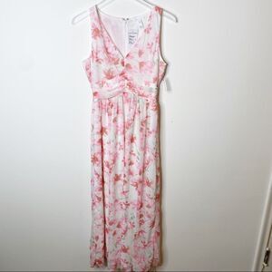 Brand new with tags, sleeveless maxi dress, pink and red hues, fully lined, back zip entry, v-neckline, rouched waistline. Size XS measures 18” pit to pit 54” long & 26” waist #15 #22