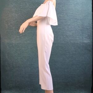 Pretty off shoulder jumpsuit, cropped length, with flounce draped from the bare shoulder neckline.