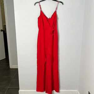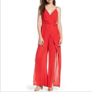 Leith Red Faux Wrap Side Tie Slit Leg Jumpsuit