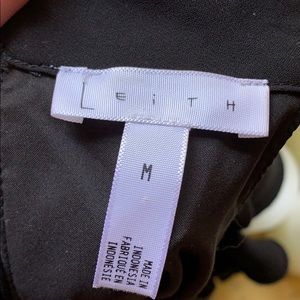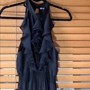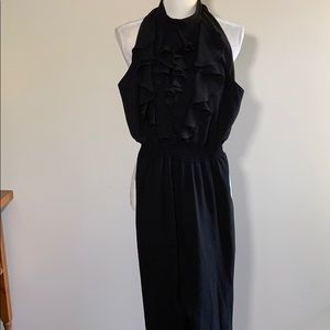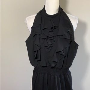 Leith Ruffle Front Jumpsuit-Black. Flattering shirred , back keyhole with double button loop enclosure, mock turtleneck. Super comfy for a long night out. 57” length, 32” inseam, 12” leg opening.