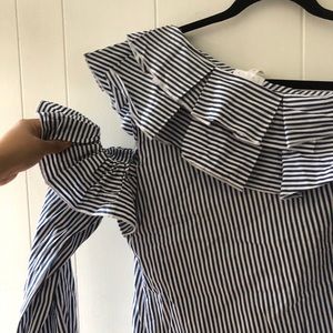 Fun! White and navy blue striped, ruffled long sleeve top. One shoulder on one side & cold shoulder cut out on the other. Long sleeve with white button details. Barely worn. Excellent condition. Offers are welcomed. Thank you.