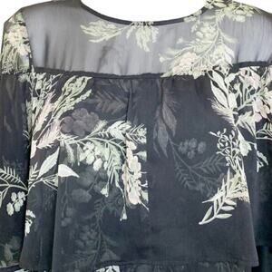 Fun and Flirty this tiered black blouse has beautiful green and lavender flowers. Floral. Boho. Bohemian. Flutter. Feminine. Delicate. Date night.