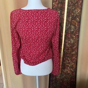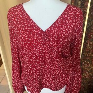 Red and white floral blouse vibrant print details this lightweight blouse with a wrap front and high/low hem.