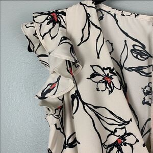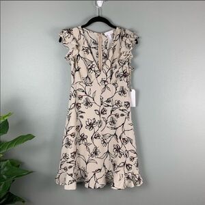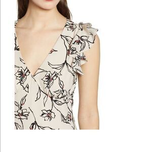 This date-night mini is covered in eye-catching blooms with fanciful frills dancing along the sleeves and hem.