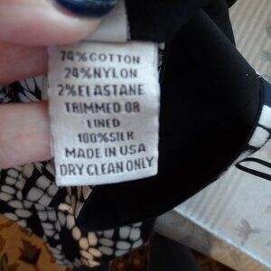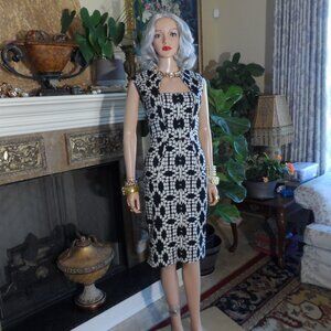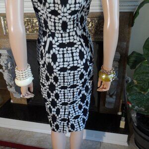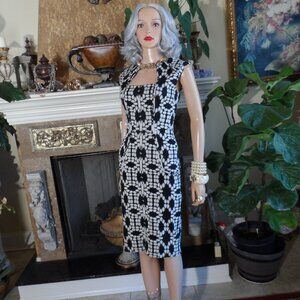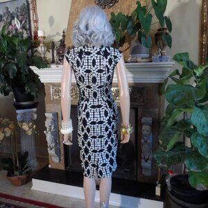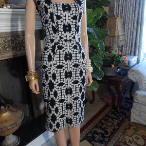 The Lela Rose Black & White Print Sheath Dress is a timeless and elegant piece designed for a sophisticated look. Featuring a striking geometric black and white pattern, this dress is tailored in a figure-flattering sheath silhouette. The cap sleeves add a touch of refinement, while the structured bodice enhances the fit. A back zipper closure ensures ease of wear, and the dress is crafted from a high-quality cotton blend for comfort. For a luxurious feel, the dress is fully lined in 100% silk, making it as comfortable as it is stylish. This Size 2 dress is perfect for formal occasions, cocktail events, or an elegant evening out. Measurements are approximate: Bust 34", waist 26.5", hips 34", length 40". In excellent pre-own condition. Comes from a smoke free home.