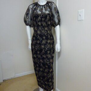 Oh the pure romance of this dress! Stunning tailored bodice and sheath-inspired skirt is topped with a luxurious contrast corded rose tulle overlayer, gathered at the neckline and rich bell sleeves. The perfect play of shadow, texture, and luscious detail.