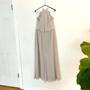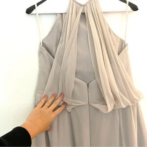 Blush halter bridesmaids dress with beautiful back. Worn once for a wedding and dry cleaned. No visible stains. No alterations except maybe hemline. For reference I am 5’1.