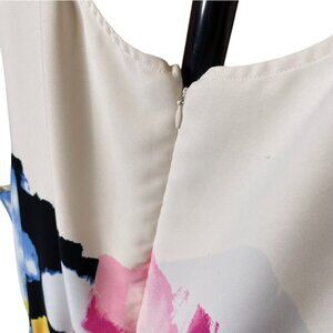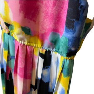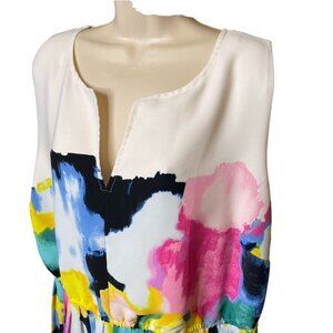 This Lane Bryant sleeveless dress designed by Lela Rose is a plus-size 28. The midi-length dress features an abstract pattern in colors of white, blue, yellow, and pink. It has a pleated bottom, back zipper, and elastic waist.