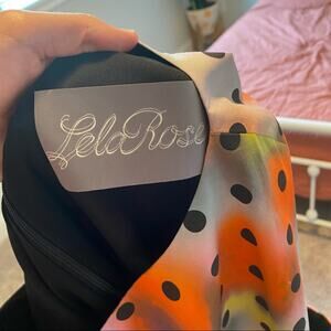 features fun bright orange/red/pink/yellow colors with black polka dots