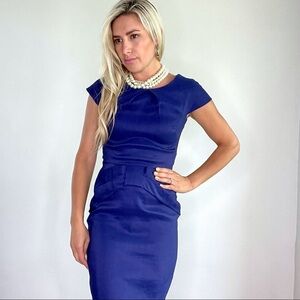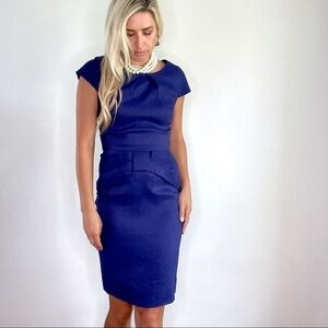 Lela Rose Royal Blue Linen & Silk Sheath Dress with short sleeves. Almost capped sleeves. Knee length, I am 5’8 and it hits above my knee.