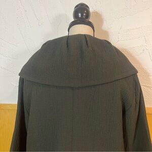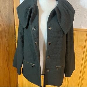 Pretty dark green waffle textured wool long sleeve jacket with a oversized pleated collar, zipper front pockets and snap front closure. In great worn condition. Approximate measurements laying flat: bust 20” across from armpit to armpit, sleeve length 23” and length 27.