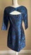 This dress features a silk blend, fit & flare style, front chest cut-out detail, deep V-back, hidden back zipper, three-quarter length sleeves, metallic blue & black abstract pattern fabric, and pleated detail at waist. Excellent condition - no flaws.