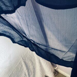 Gorgeous Full length Sleeveless Crinkle Bridesmaid Sample Dress by Lela Rose, in the color Midnight, with sheer fabric at neckline, sheer long peplum ruffle with border of doubled fabric