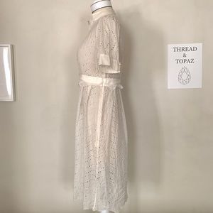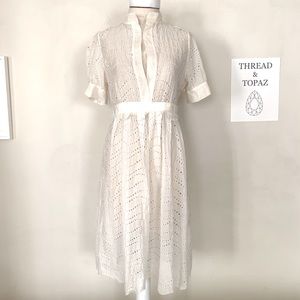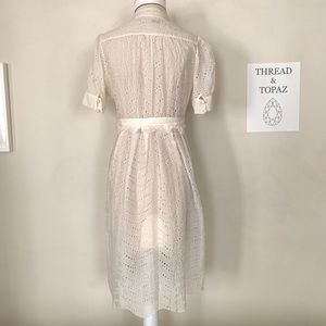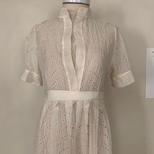 Lela Rose white eyelet dress in silk and cotton blend. Size 4. This dress is very feminine, delicate, and a bit sheer. You will need to wear a slip with this. Very small discolorations (see photos) Measurements have been added in photos.