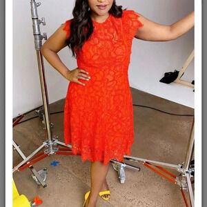 Guipure lace in a searing scarlet hue brings Lela Rose sweetness to this beautifully tailored A-line in the most charming midi length. A truly beautiful piece!