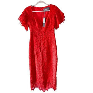 Lela Rose Women's Red Lace Floral Guipure Flutter Sleeve Sheath Midi Dress 2