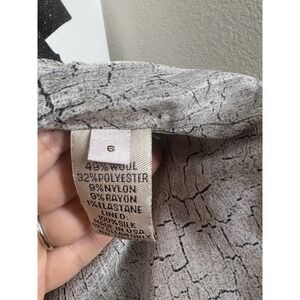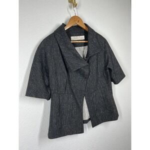 Lela Rose wool blend tweed blazer jacket. Charcoal with white specks. Short sleeves. Side pockets. Asymmetric snap button top closure with open bottom. Silk lined.