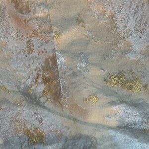 Dress is perfect for a cocktail party or wedding. Top of dress is sleeveless cream-colored satin. Skirt portion of dress is jacquard material with metallic stitching. Dress hits at knee. I am 5'10" for reference.