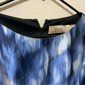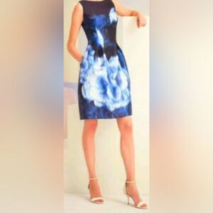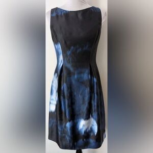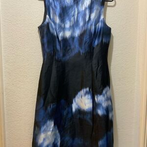 This stunning Lela Rose dress size 4 is in excellent pre-owned condition. It features a navy base with a blue and white floral print. It has a flattering fit and flare cut with pleating. The dress is fully lined. There are side slit pockets. The back zips up. There is no stretch to the fabric. The shell is 100% silk and the lining is 100% polyester. The dress is dry clean only. Made in the United States.