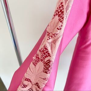 Stunning pink silk dress, with crochet detail on the sleeves, mini length, 3/4 sleeve detail. gently preowned, no signs of wear. Size 14, HOWEVER there is no zipper, only a hook and eye closure, which my size 4 mannequin could not get it over the shoulders. Not sure how it would fit a size 14 without a zipper to get into.