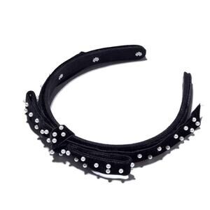 Timeless Lele Sadoughi slim headband in black velvet with sweet ribbon detail and scattered faux pearls. Classic padded shape that is slim but still noticeable, finished with the gold Lele Sadoughi logo at the tip.