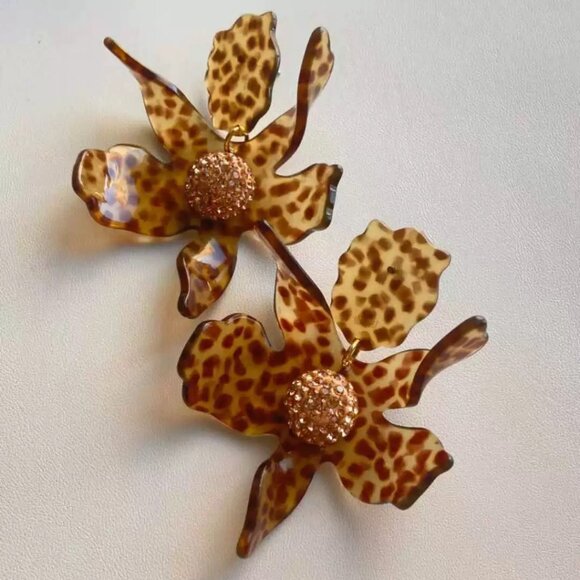 3" by 2 1/2" leopard hand swirled acetate lily flower with a 3/4" czech pave crystal center.
