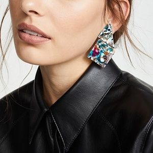 Stacked square and triangle in hand swirled acetate measuring 1 1/4" by 2 1/2" with a surgical steel post. Lightweight and easy to wear day to night. Color: Turquoise confetti
