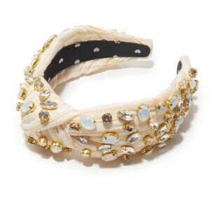 Elevate any outfit with this stunning blush stripe seersucker headband. Crafted from 100% cotton and hand-embellished with sparkling round, oval, and navette crystals set in 14k gold plated prongs, this accessory combines luxury and comfort. With a 1 1/2" knot and a comfortable fit band, it ensures style without sacrificing wearability. Designed in NYC, this headband showcases unique trims and a distinctive look that makes it a must-have addition to any accessory collection.