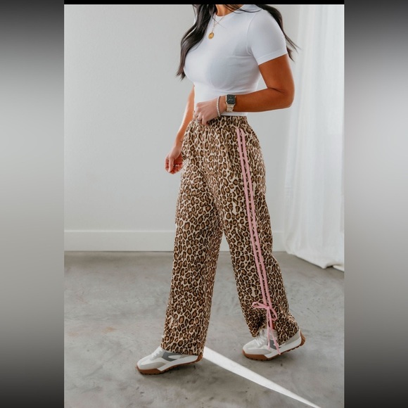 These Pull On Track Pants Feature A Pink Bow Tie Detail Down The Side, Leopard Print With Side Zipper Pockets, Stretchy Elastic Waistband, Comfortable, Wide Leg, Trendy