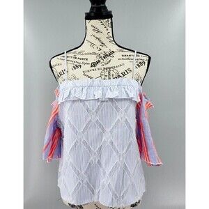 LemLem Top Womens Small Blue Striped Off-the-Shoulder Frayed Ruffled Detail Boho