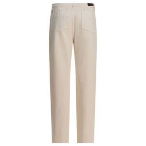 Lemaire "Twisted" pants with five-pocket construction, made of thick denim with a compact texture. The construction features twisted seams along the leg, woven front panels and contrast stitching. The design features a straight cut, belt loops at the waist, button closure and concealed zipper. Back patch pocket and metal rivets complete the design, along with embossed leather jacron on the back.
