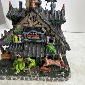 The Lemax Spooky Town Creepy Crawlies Pet Sitting house is a ceramic and porcelain collectible from the Halloween collection released in 2017. This rectangular-shaped house in multicolor with a gothic style is perfect for any room during Halloween. With a spooky subject of monsters, this piece adds a fun and festive touch to any Halloween village display.