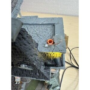 Pre-owned. House has some damage/missing pieces. The lock with the key, the hunted hotel sign, the top figurine, inside figurines on stairs and window glass are missing. The parts of the house that are supposed to rotate, do not rotate and make a clicking noise. Sound and light Work.