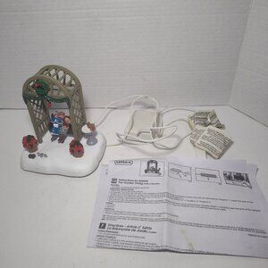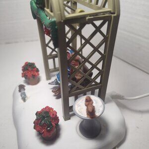 Bring charm to your holiday village with this Lemax Swinging Couple scene. This piece features a winter gazebo arch with a couple seated on a swing, festive garland, wreath décor, poinsettias, birdbath, and a squirrel figure.