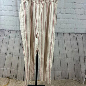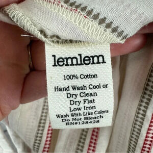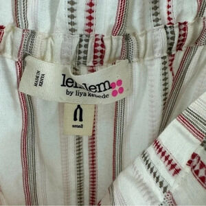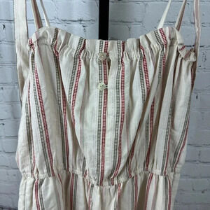 Lemlem jumpsuit size small. This is the “Imani” jumpsuit. Cream color jumpsuit with red and beige stripes. Matching belt, not attached. Good condition except for a small mark on crotch area and one of the back straps is coming off slightly (see pics). Smoke free home.