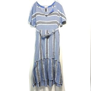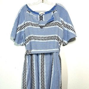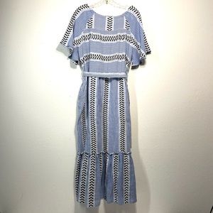 Blue, black and sky blue cotton-blend Kesiti butterfly kaftan from Lemlem featuring a round neck, short sleeves, a ruffle trimming, a tie waist, a long length and a striped pattern. POSITIVELY CONSCIOUS: We’ve joined forces with ethical agency Good On You to give you the power to choose positively. This piece is from a brand that scores well on their key criteria.