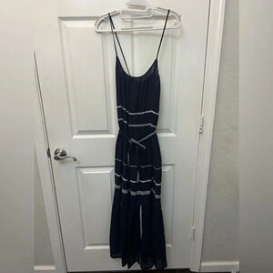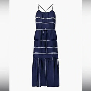 Lemlem Nunu Sun Dress in Navy The Nunu Sun Dress features a maxi/midi length finished with a tiered ruffle hem and a flattering scoop neckline that is finished with a criss-cross in the back. Add the belt for a cinched look
