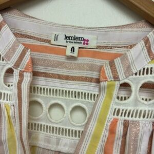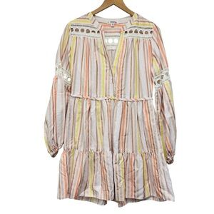 Amazing Lemlem by Liya Kebede Retta Mini Dress in Salmon Metallic Stripe. Tiered hem. Seamed waist. Embroidered lace trim and yokes and sleeves.
